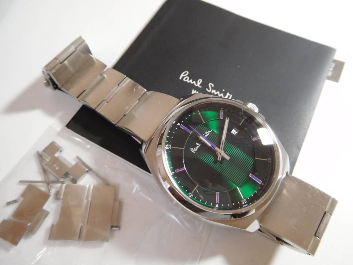 見事なエメラルドグリーンの文字盤で綺麗です。おしゃれです。 有名ブランドポールスミスの腕時計、電池式クォーツ製 フェイス(竜頭含むケースサイズ) W約4.1cm 腕回り最大約14cm コマと取り扱い説明書があります。 現在は動いていますが、発送までに電池切れになるかも知れません。 電池を入れ替えたら動きます。 送料はこちらが、負担します。 |