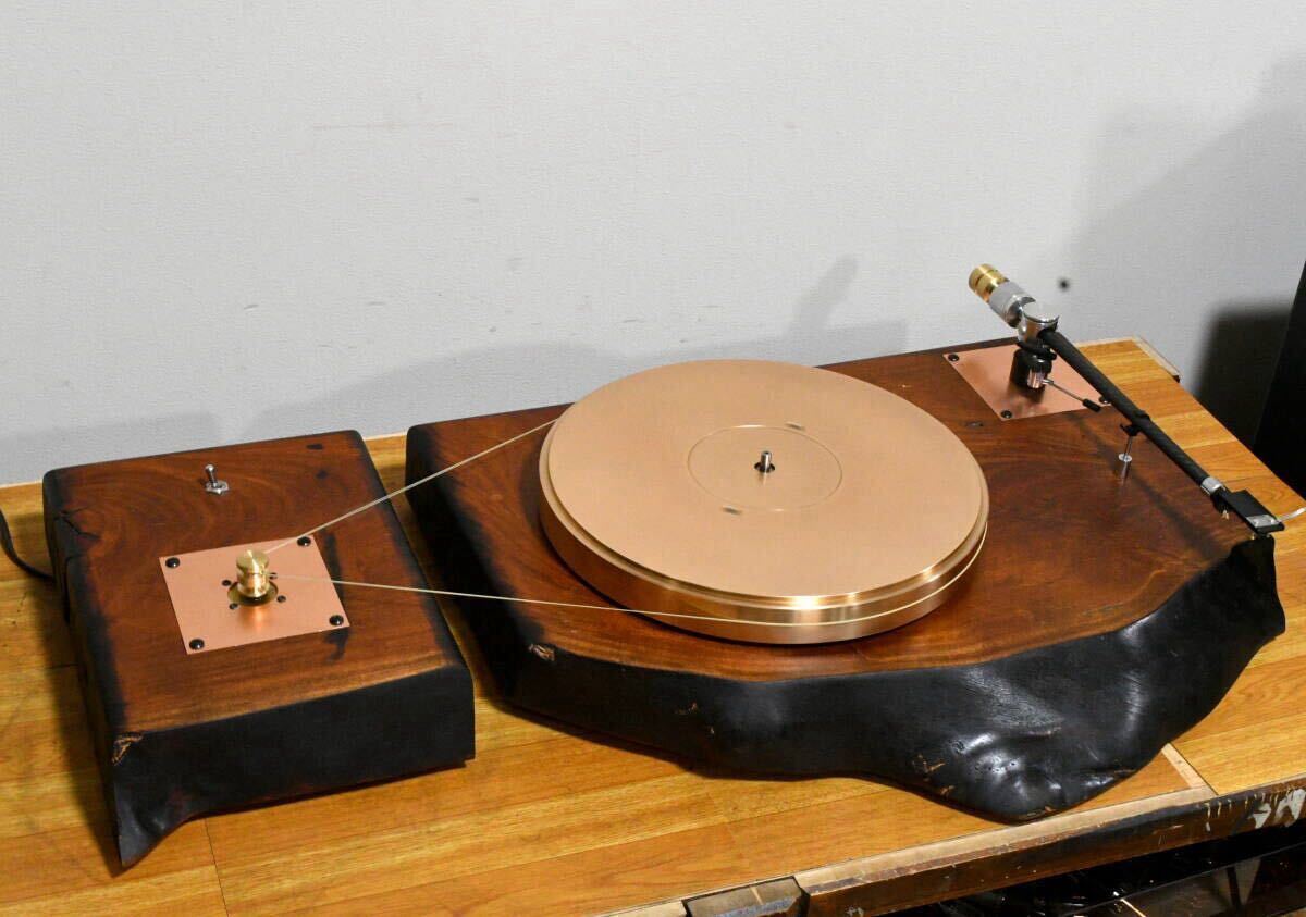 珍品★ 一枚板のターンテーブル 糸ドライブ方式 ピュアストレート・トーンアーム付き 50/60Hz対応★美品です。 フラッターとベアリングはマイクロ製機製の物を採用しました。真鍮フラッタ―が美品です。 糸ドライブとなり、モーターに50、60Hzが対応するプリがついていますが、60Hzのプリは動作未確認です。 ピュアストレート・トーンアームについて 一般のヘッドシェルが使えるので、ヘッドシェル交換、カートリッジの交換が便利です。 オフセット角ゼロのピュアストレート構造となっているためカートリッジの針やカンチレバーが中心線と一直線上で重なり、トレーシングに際して常に安定したバランスを保っています。また、オーバーハングがマイナスとなるため、アーム実効長を30mm以上も短縮でき、高剛性・低共振化を実現しています。 有効長:282mm オーバーハング:‐20mm~-18mm アームセンターからターンテーブルのセンターまで300mm サイズ: ターンテーブル:W55xD45xH15cm モーター:W22x34x12cm 動作確認ビデオ> https://www.youtube.com/watch?v=W-HjNyltMlQ https://www.youtube.com/watch?v=SmbfPidhC-w