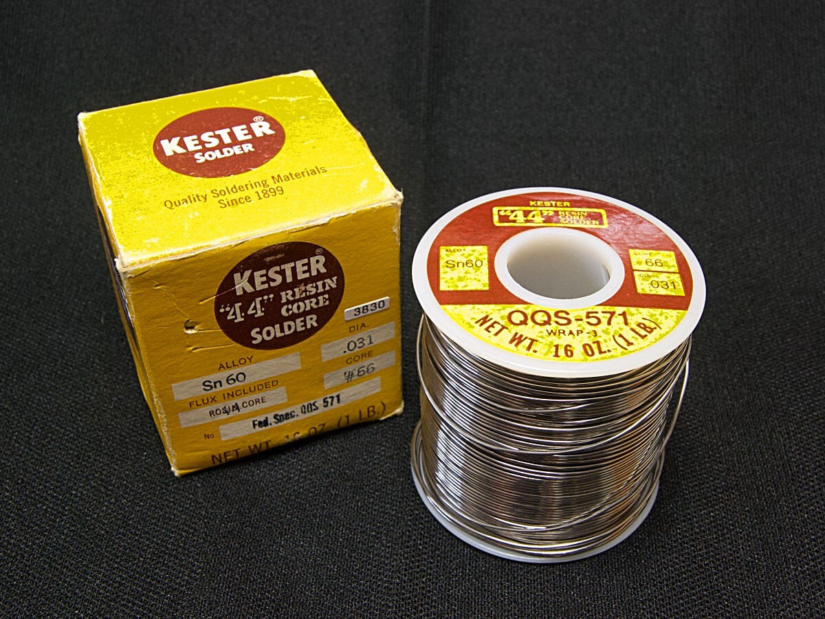 ビンテージ・ソルダーの定番、ケスターの"44"シリーズです。プラスチック・スプールから判断して1970年代の製品と思われます。長期在庫の新品箱入りですが古い物なのでハンダの巻きがバラけています。複数在庫していますので写真は代表的な商品の姿です。 |
