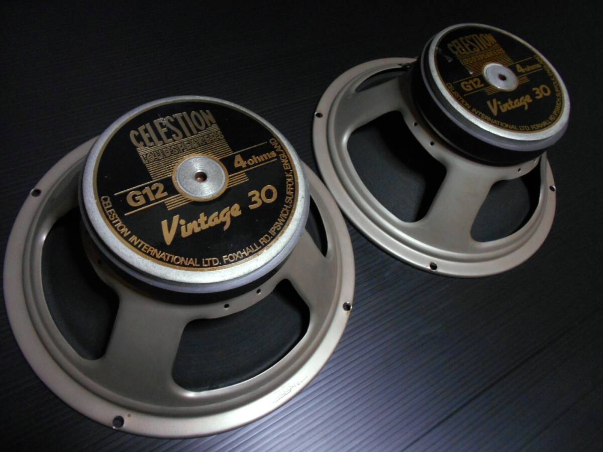 CELESTION Vintage 30 T4617 MADE IN ENGLAND 4ohm×2本セットの出品です。 現行品の中国製Vintage 30とは違い、英国セレッションにて製造されていた時期のものです。 状態について、若干キズはあるものの全体的に見ても使用感は少なく、実際の動作も良好です。 公称抵抗値は4オームですが、直列に繋いでシリーズ接続にすれば8オームでも使用可能です。 ジェンセンやフェンダー、コンボアンプや2×12キャビネットの交換用途にもいかがでしょうか。 ご落札後のサポート等は一切できませんのでノークレームノーリターンでお願いします。 発送は日本郵便ゆうパックおてがる版(~100cm)を予定しております。 お探しの方はぜひご検討下さい。
