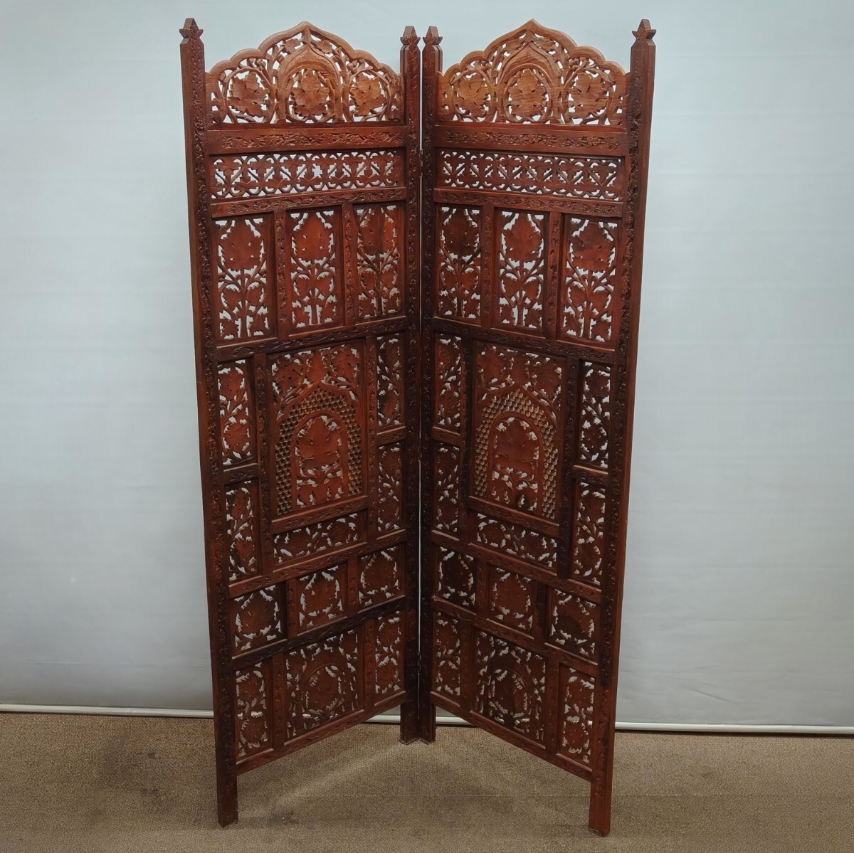 木製 パーテーション 木彫 透かし彫り 衝立 折り畳み インド バリ シーシャムウッド アジアン エスニック インテリア ビンテージ (11307H サイズ:展開時H152×W101×D2 折り畳み時H152×W50×D4 【商品状態】 ●この商品は中古品です。ご理解いただき入札お願致します。 ●写真の品が全てです。 ●直接お引き取りも大歓迎です!大阪府JR柏原駅から半径10km圏内までなら3000円で配達可能です。それ以外はクロネコヤマトらくらく家財便Cランクの配送になります、配送料は画像欄でご確認下さい。 ●ヤマト家財便をご利用の場合、必ず電話番号が必要になります。 【発送方法】 ●ヤマト運輸 元払い ●落札金額+送料を、お振込み下さい。 ※その他の発送方法はお取り扱いできません。 ※梱包材料について、ダンボールやプチプチ・緩衝材など使用済みのものを 再利用させていただいておりますので、御了承下さい。 出来る限り破損のないように、しっかり梱包させていただきます。 【支払方法】 ●Yahoo!かんたん決済 ※支払い手数料は落札者様がご負担ください。 ※その他の振込み方法はお取り扱いできません。 ※ご入金完了後ご連絡をお願いします。
