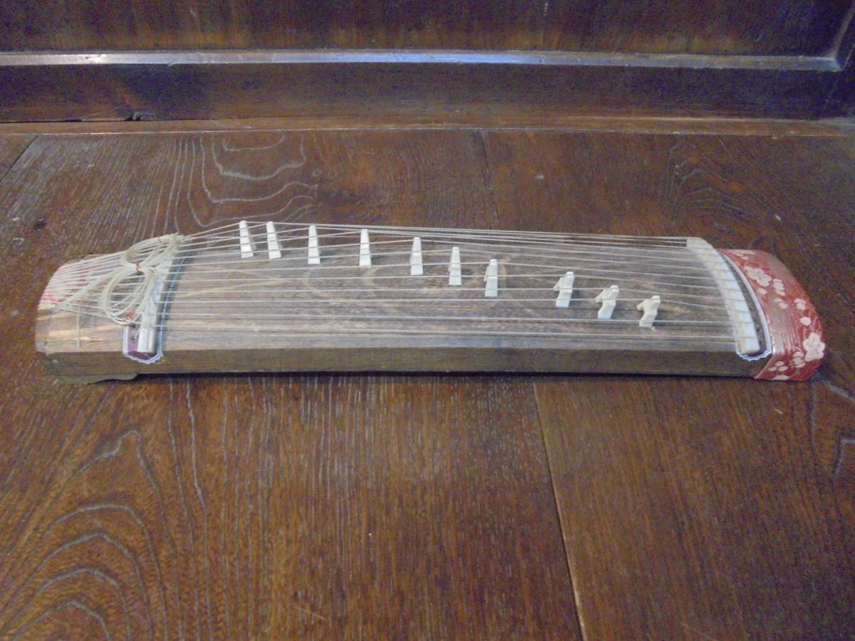 古道具の市で見つけた古い小さな琴です。 おもちゃにしてはかなり精度のよいものですが、弦を弾くと柔らかく響く音色は見事なものです。 音調は琴柱の調整や弦の張り具合をチューニングしていただいたほうが良いかもしれません。 現に切れはありません。 本体に亀裂などはありませんが片足が欠損しております。 寸法は42cm9.5cm高さ6cm 送料は本州一律950円です。 北海道九州は1200円です。離島沖縄は発送できません。 複数御落札予定の場合はできる限り同梱いたしますので、その旨お伝えください。 |