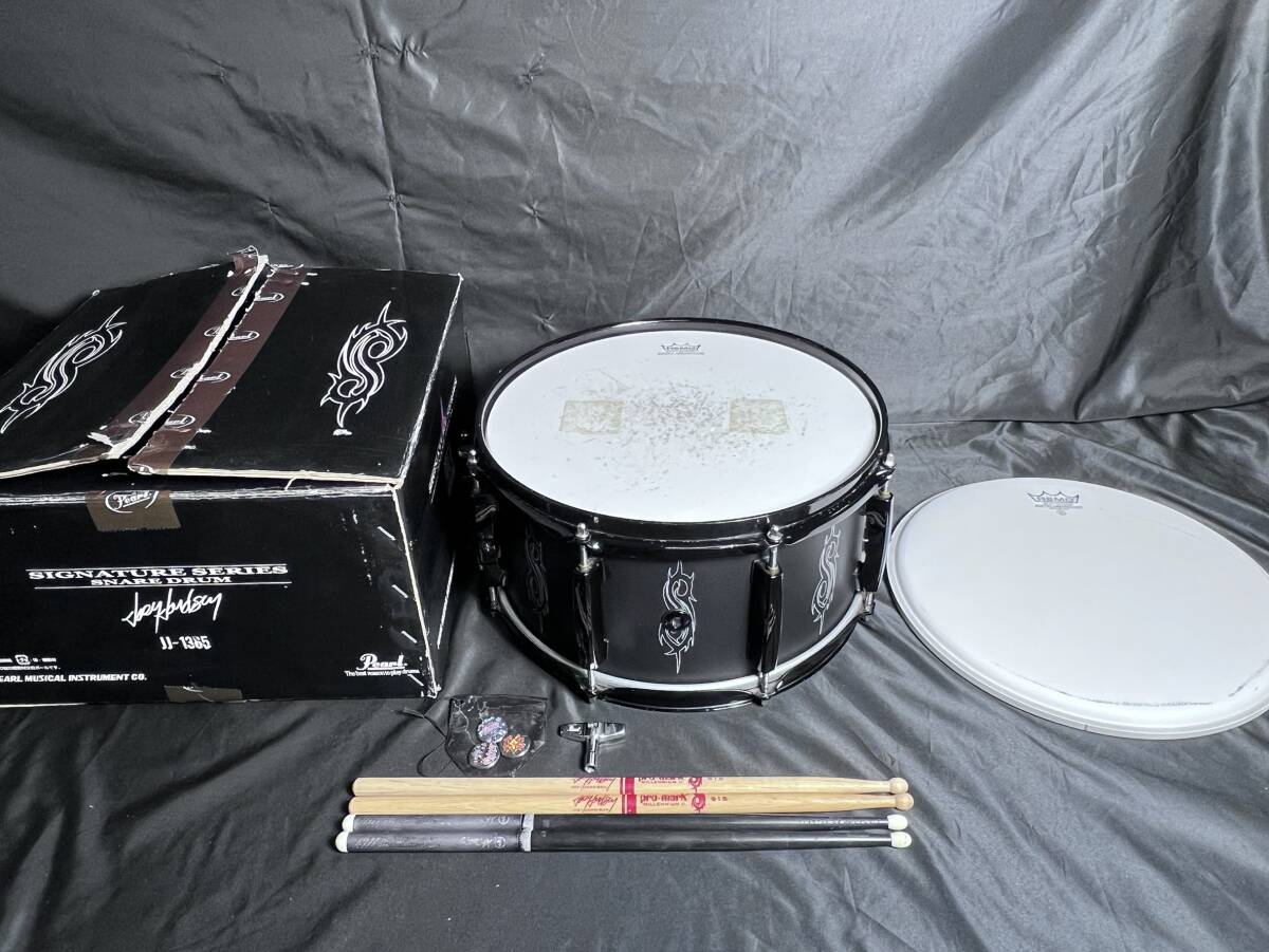 約20年ほど前にそれぞれ楽器店にて新品で購入したものです。 そのうち13年ほど倉庫にて保管しておりました。 今は亡きスリップノットのドラマー ジョーイジョーディソンのシグネチャーモデル3点セットです。 スネアドラムJJ-1365は、現行のJJ-1365Nとは違う希少な初期型のSロゴ付きのものです。 13" x 6 1/2" (33.02cm x 16.51cm) 箱ありで保管していたのも珍しいのではないでしょうか。 ドラムスティックは、ジョーイモデル第一弾であるAHEADのアルミ合金製スティックと、 PRO-MARKから発売された第二弾のヒッコリー製スティックです。 着色汚れ等あるものの未使用品であるREMOのヘッド、チューニングキー おそらく購入特典だった未使用のSlipknot缶バッジ3種もおまけで付けます。 スネアドラムの状態は、全体的にサビや小傷はあるものの 大きな傷や欠け、歪みも無く機構の異常等も一切ありません。 開封済み 使用済みの約20年前のスネアドラムと言うことを考えると美品の部類かと思われます。 アヘッドのスティックの状態は持ち手の印字が薄くなっていたり、全体的に傷があり使用感があります。 プロマークのスティックの状態は開封済みではあるものの 完全に未使用 なので当然チップの減り等ありません。 発売から20年経とうかと言う廃盤品かつ、未使用の物も含まれるジョーイのシグネチャーシリーズセットなので この機を逃せばなかなか手に入らないのではないでしょうか?ファンの方は是非!